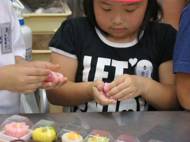 次は、奥の工場へ入って、いよいよお菓子づくりの体験です。和菓子の元になる素材の説明から入って、実際に作っていく手順などを教えながら、和菓子を作っていきます。今回子供たちにチャレンジしてもらったのは、生菓子を使って、秋の季節に咲く花「コスモス」です。何種類かの素材をまるめて包んで、最後に花びらの形を作っていきました。