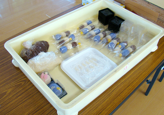 和菓子の材料は、色づけや分量は仕込んできて、個別に袋わけしてきてあるので、これを配布します。