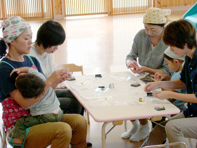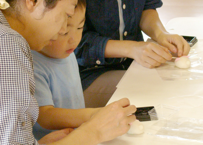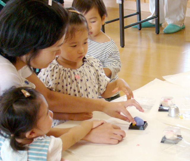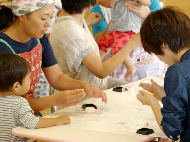 お母さんとお子さんが10組くらい参加され、わいわい楽しく和菓子を作りました。