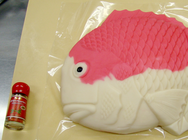 こちらは、あるお客様のお祖父さんの米寿のお祝いに特別注文で作成した「鯛(タイ)」の生菓子です。鯛の頭から尻尾まで、だいたい40cmくらいあるでしょうか。