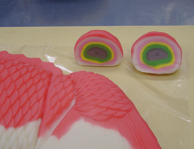 普通の生菓子の場合は、中身はあんが入りますが、このビックリサイズの鯛は、あんだけではなく、何層にもカラフルに生地を重ねて、最後の最後にあんが入っています。